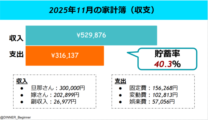 →11月:貯蓄率40.6%で変更なし。温泉旅行でも貯蓄率は下がりませんでした。